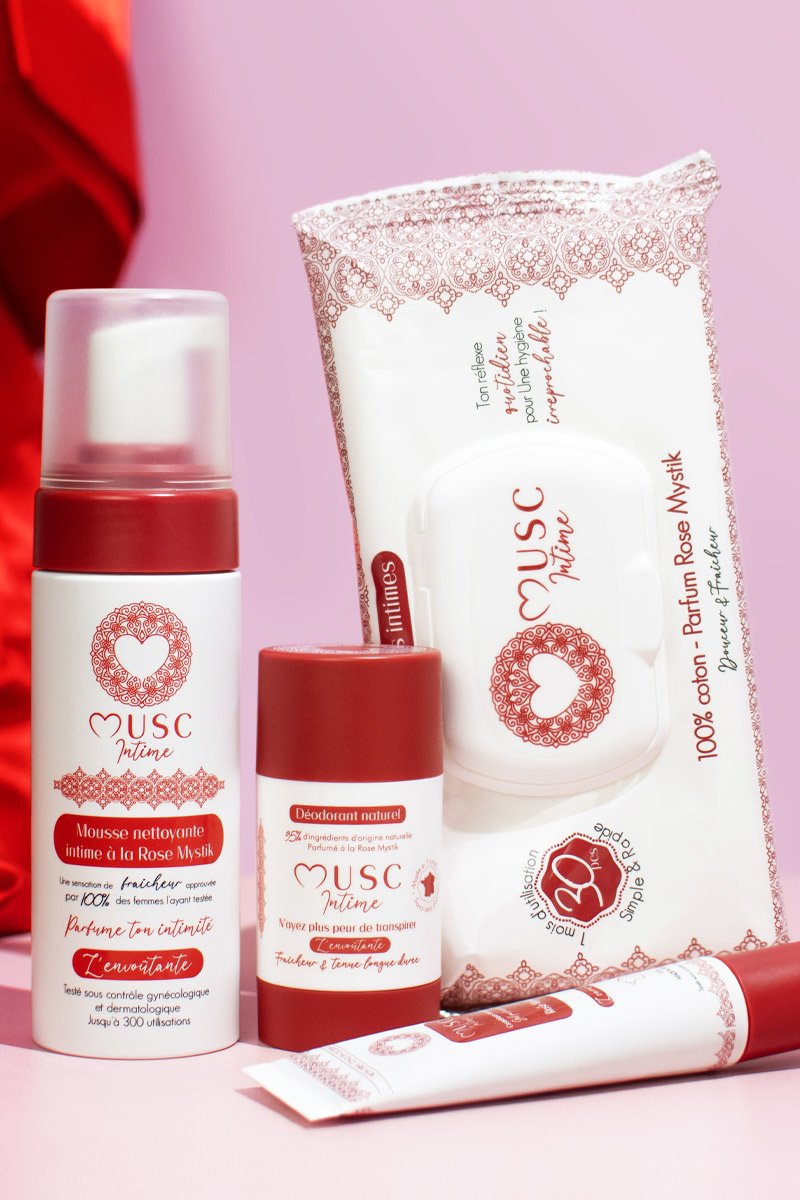 Musc Intime L'Envoutante - Rose Mystik, espuma íntima de Rose Mystik, toalhetes íntimos de Rose Mystik e desodorizante de rosa Mystik