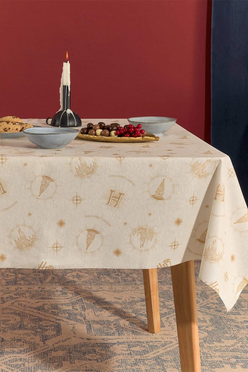 Toalha de mesa em algodão biológico com acabamento de resina Harry Potter - Bege e dourado