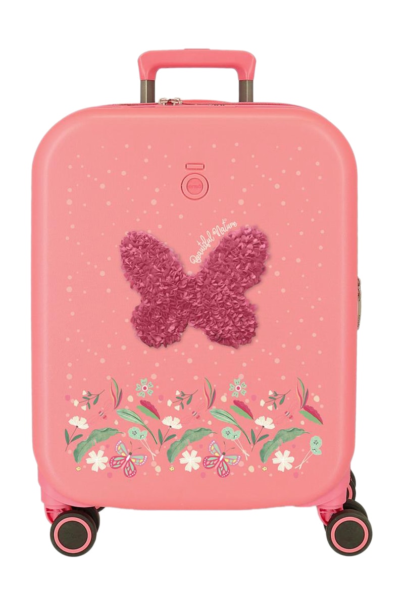 Inscrição, aplicação formato borboleta e estampado decorativo à frente.