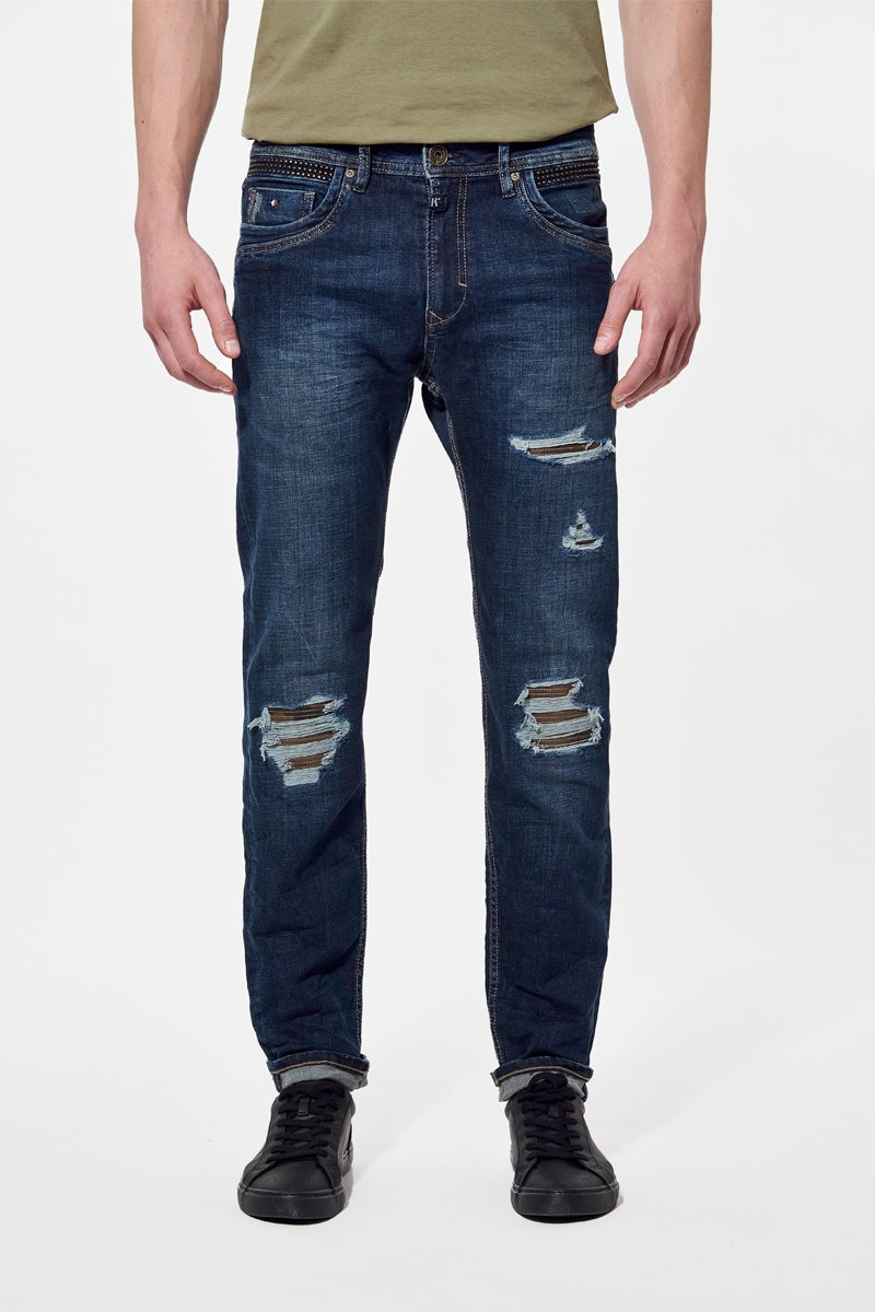 5 bolsos, 1 dos quais com estampado às riscas bordado.