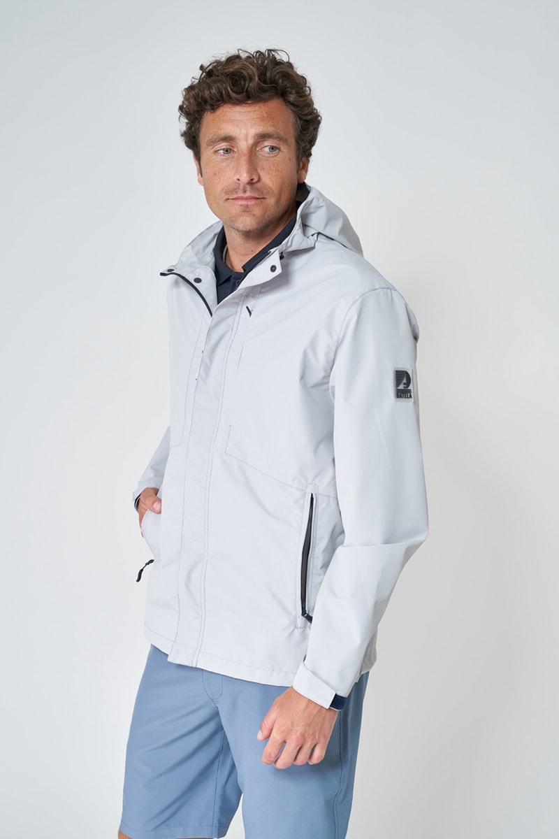 Impermeável com capuz e atilhos de ajuste.