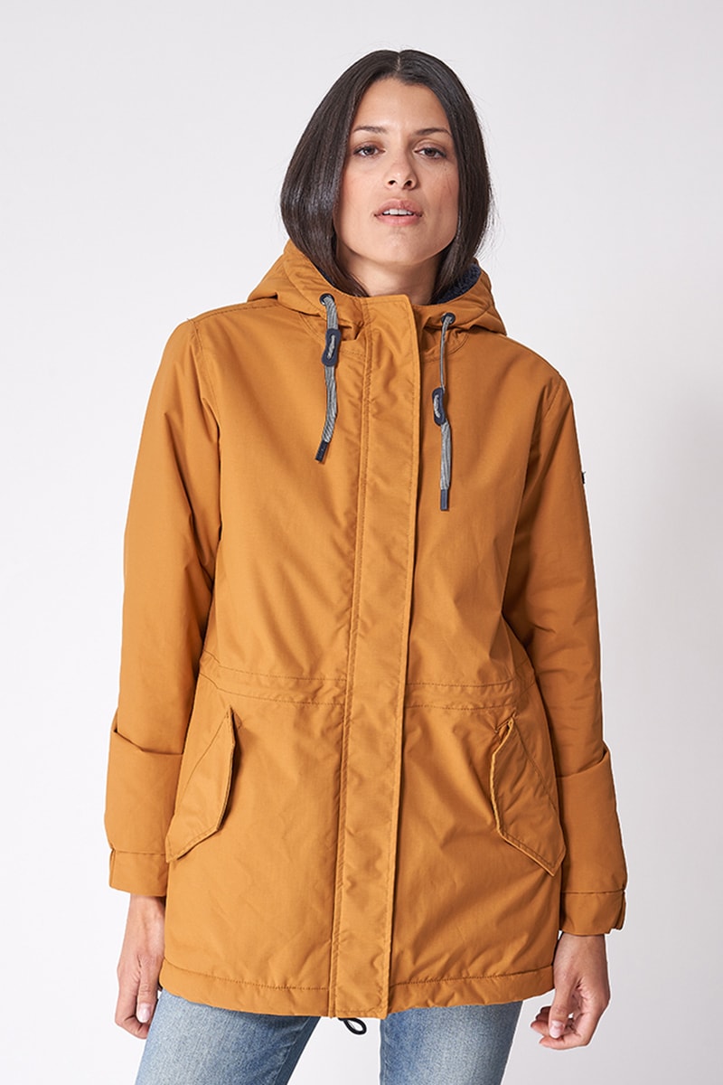 Atilhos de ajuste com travões de cordão no capuz, na cintura e na base.
