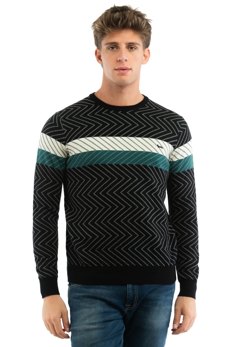 Estampado às riscas e chevrons nas mangas e à frente.