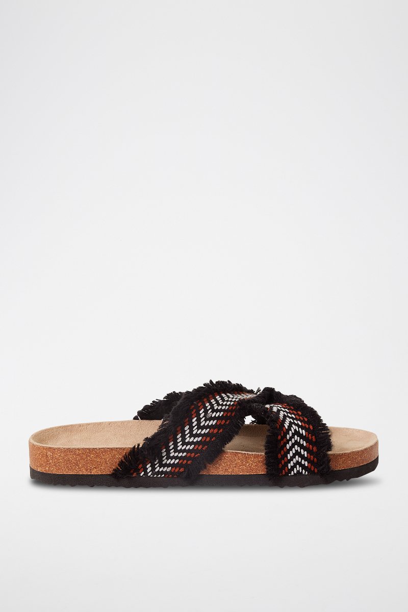 Tiras cruzadas com estampado chevrons com rebordos desfiados à frente.