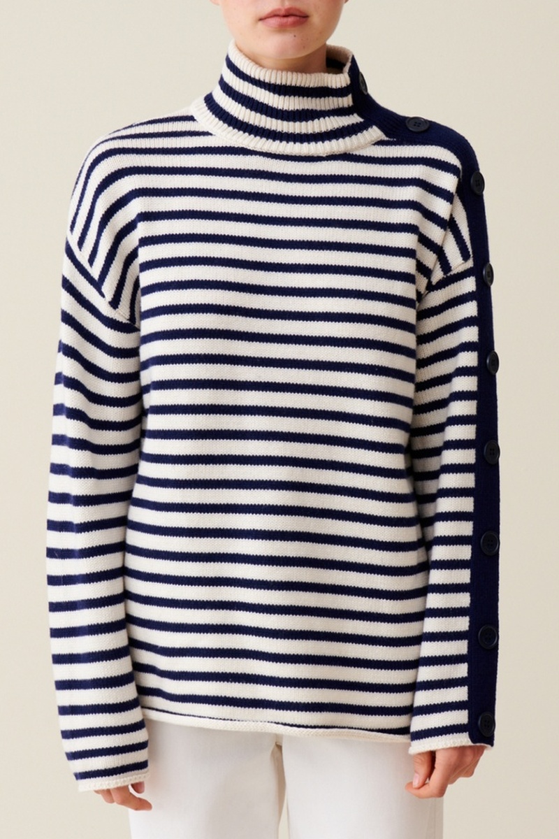 Faixa com botões decorativos no decote, no ombro esquerdo e na manga esquerda