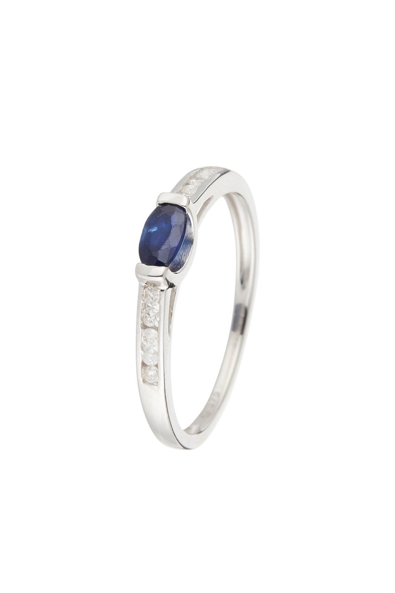 Anel de ouro branco incrustado com uma safira e 10 diamantes.