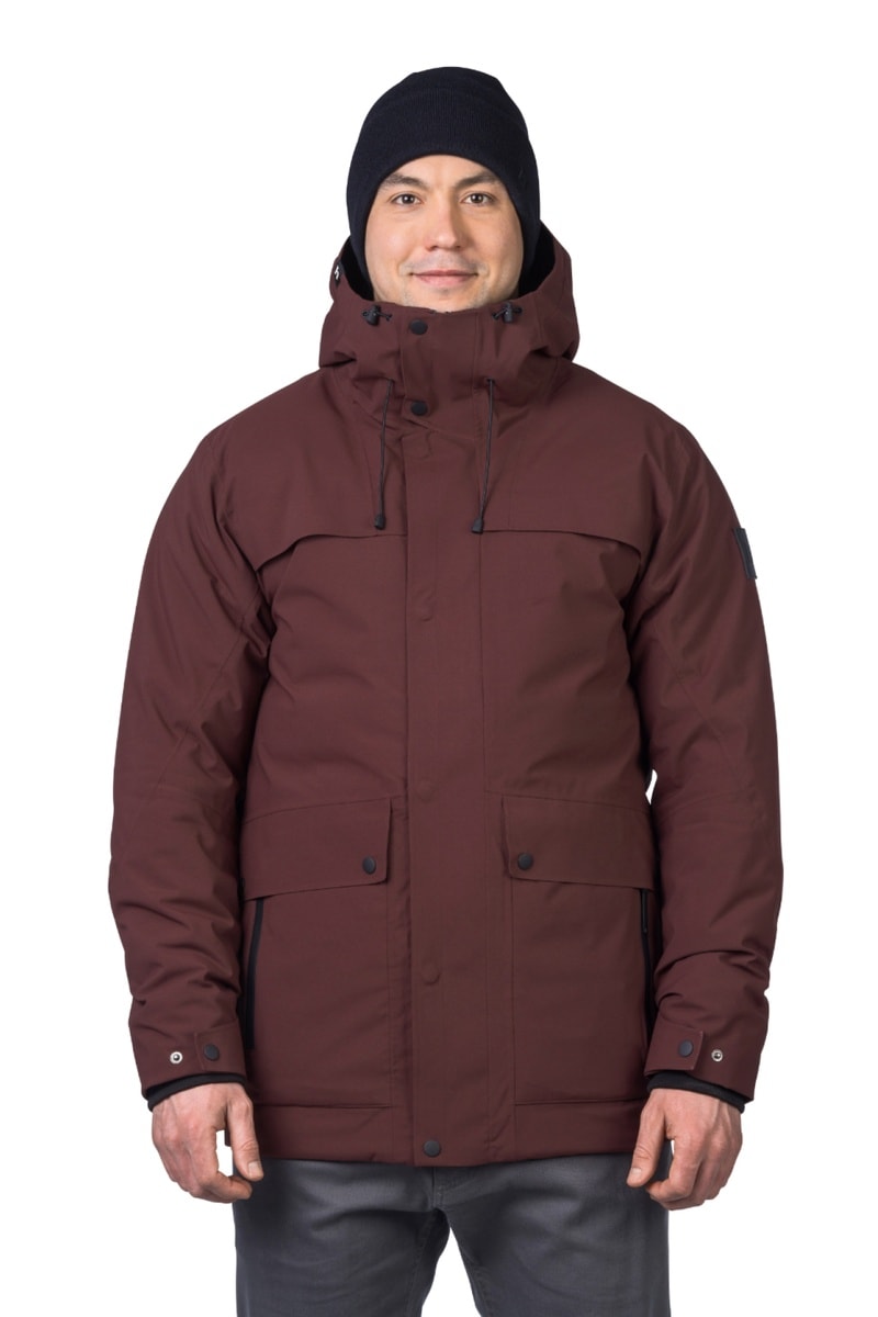 Corta-vento com capuz, atilhos de ajuste e travões de cordão.
