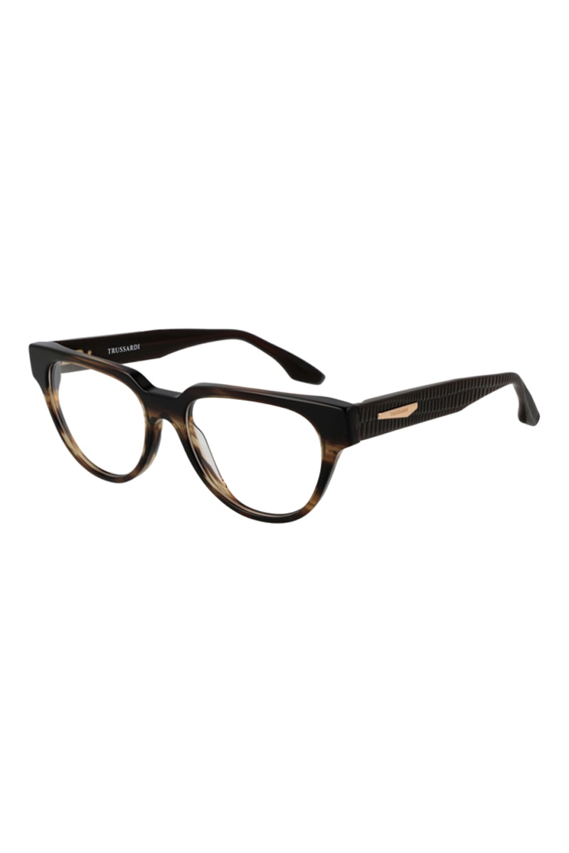 Estampado às riscas em relevo e aplicação em metal com logótipo nas hastes.