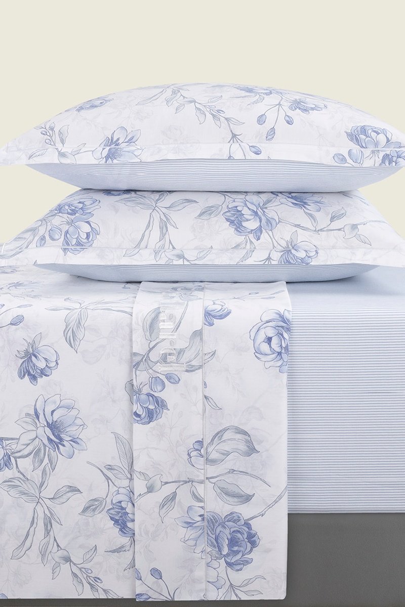 Conjunto de lençóis em cetim de algodão 80 fios/cm² Fleurs azurées - Branco