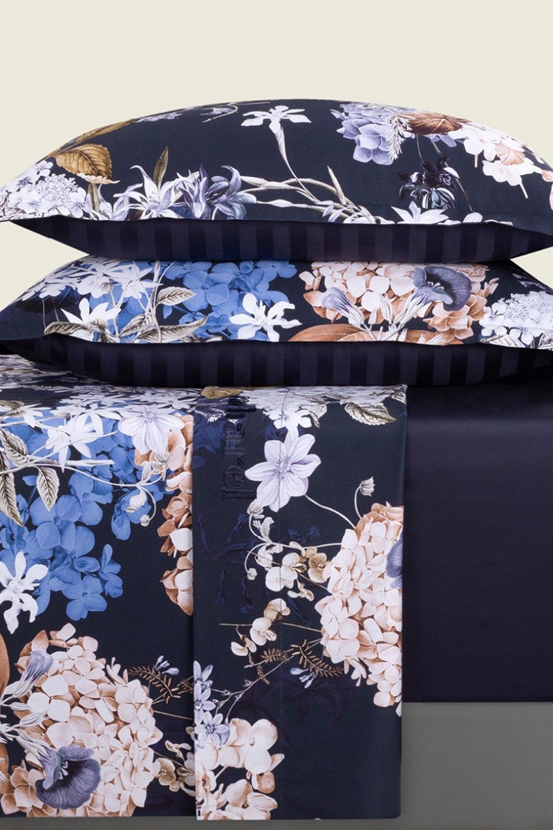 Conjunto de lençóis em cetim de algodão 80 fios/cm² Bouquet d'Hortensias - Azul-noite e bege