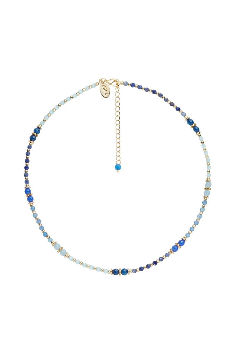 Colar banhado a ouro amarelo com sodalites, olho de gato, jade e ágata.
