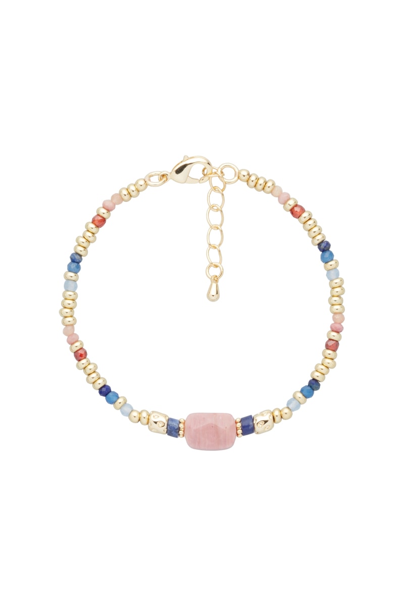 Bracelete banhada a ouro amarelo com rodochrositas, olhos de gato e pérolas de imitação.