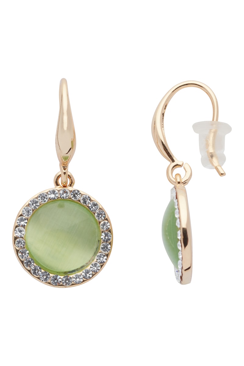 Brincos banhados a ouro amarelo com olhos de gato e cristais.