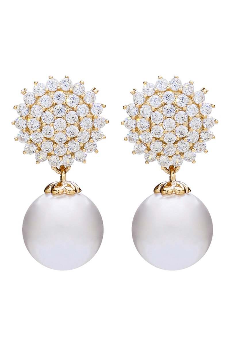 Brincos pendentes banhados a ouro amarelo com cristais e uma pérolas de imitação.
