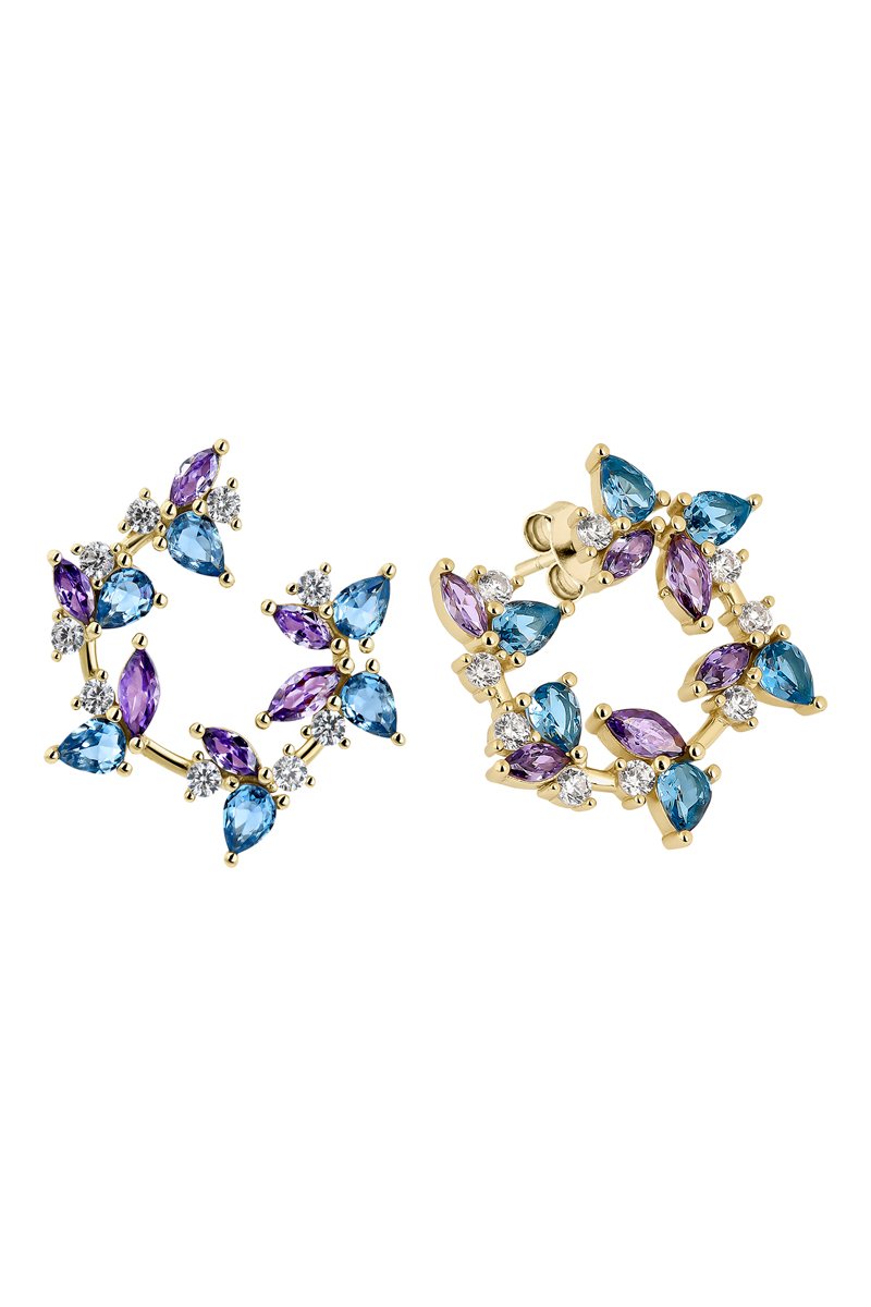 Brincos assimétricos de prata banhada a ouro amarelo com zircões e espinelas.