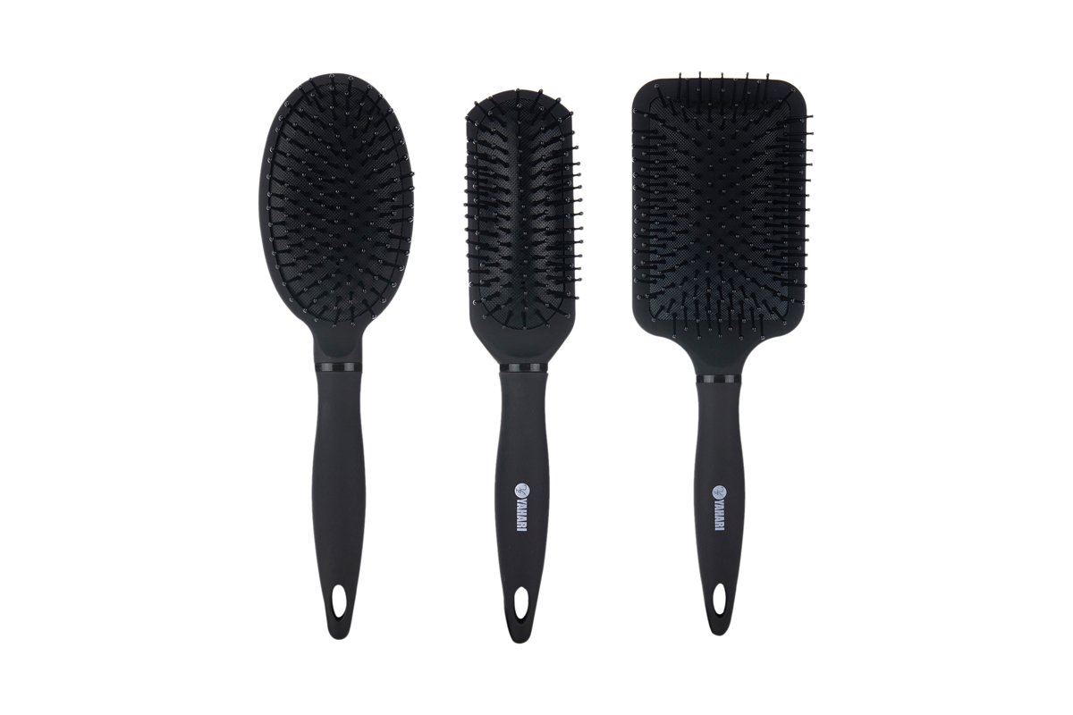 3 escovas (1 escova redonda em carvão de bambu, 1 escova raquete e 1 escova esqueleto).