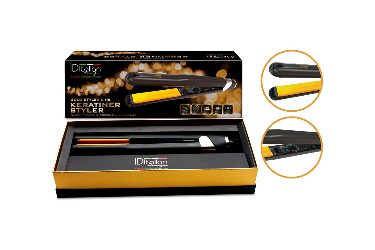 Graças à sua tecnologia cerâmica e às placas douradas lisas e inclináveis, desliza facilmente no cabelo.