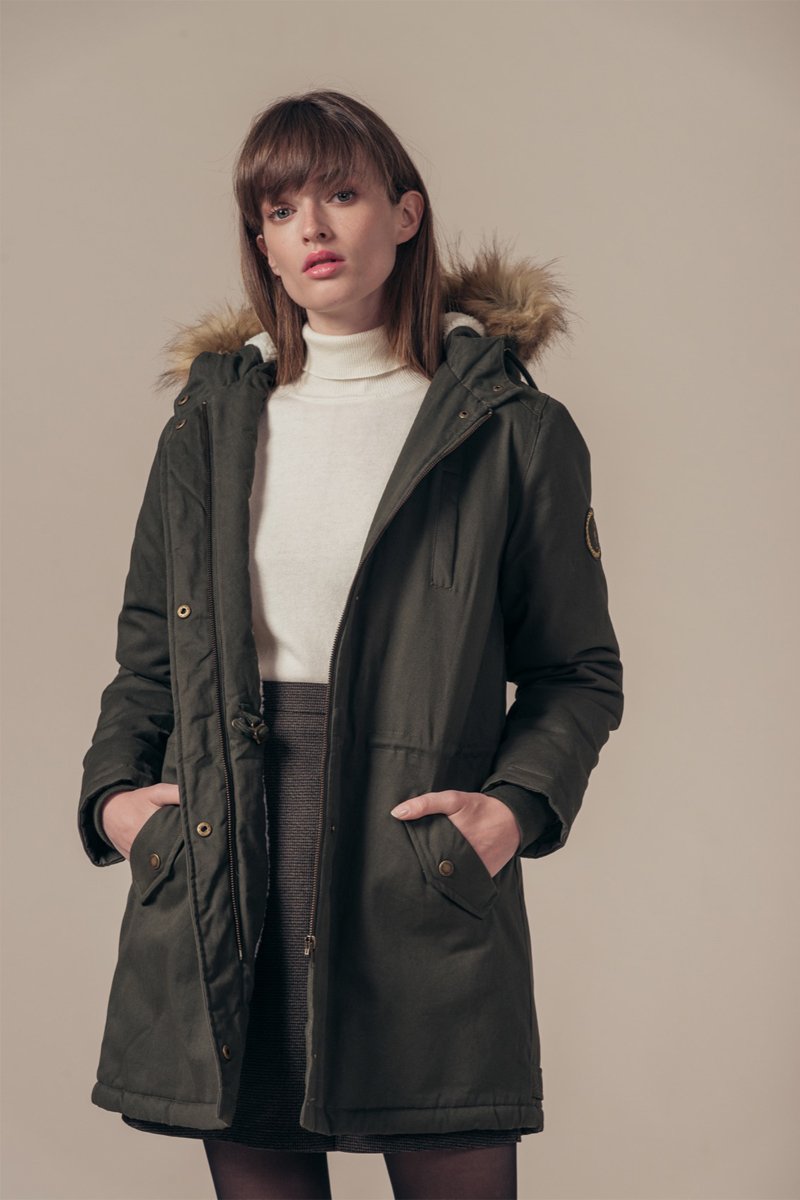 Parca com capuz e atilhos de ajuste e pelo sintético.