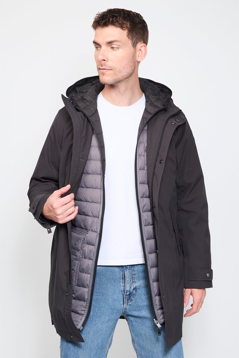 Parca com capuz com atilhos de ajuste e travões de cordão.