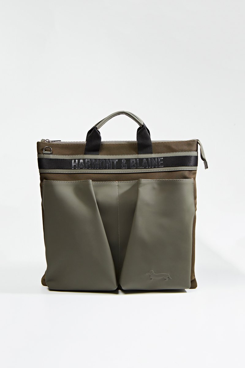 2 bolsos 1 dos quais com logótipo e logótipo em relevo à frente.