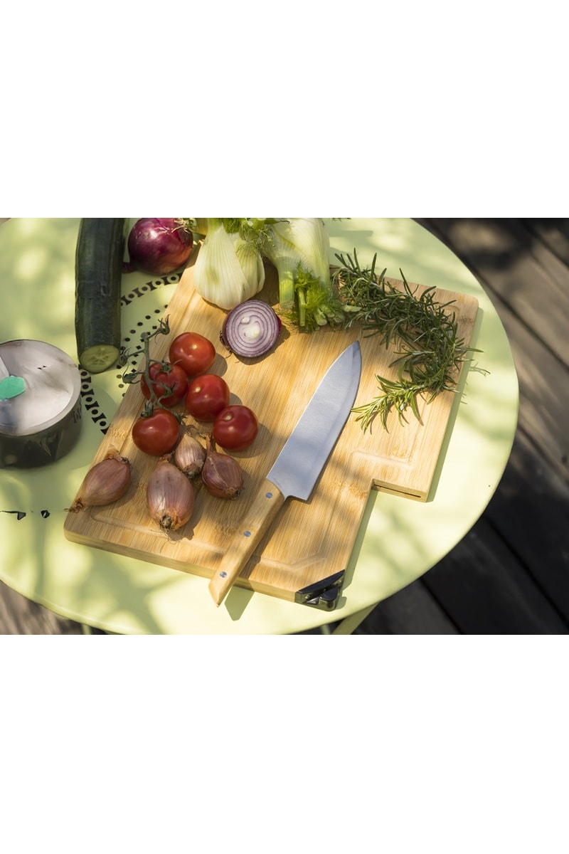 Tábua com afiador e faca de chefe em bambu e aço inoxidável Takeita