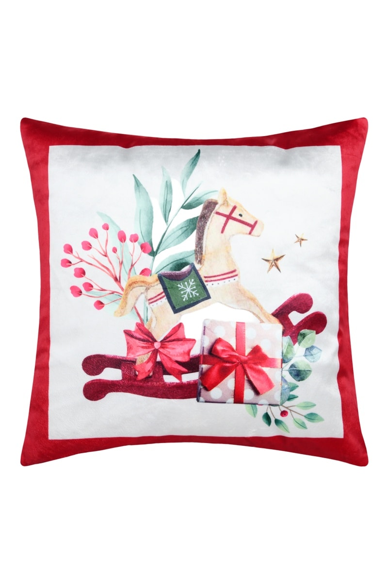 Estampado de Natal com cavalo em movimento, prendas e folhagem.