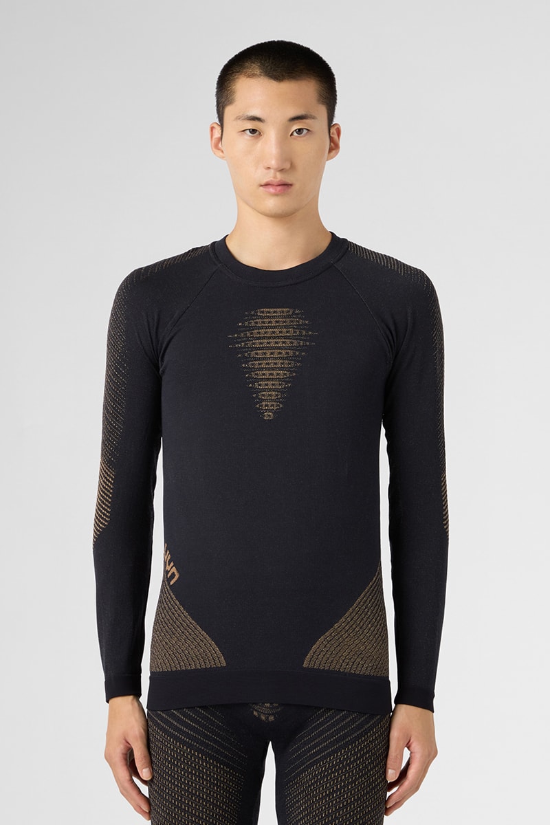 Estampado decorativo nos ombros, nas mangas, à frente, dos lados e atrás.