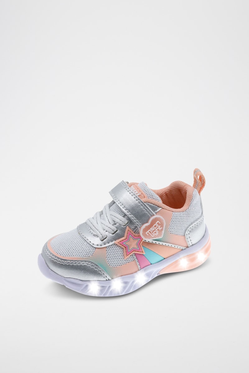 Estampado de estrelas em relevo e aplicação em forma de coração de lado.