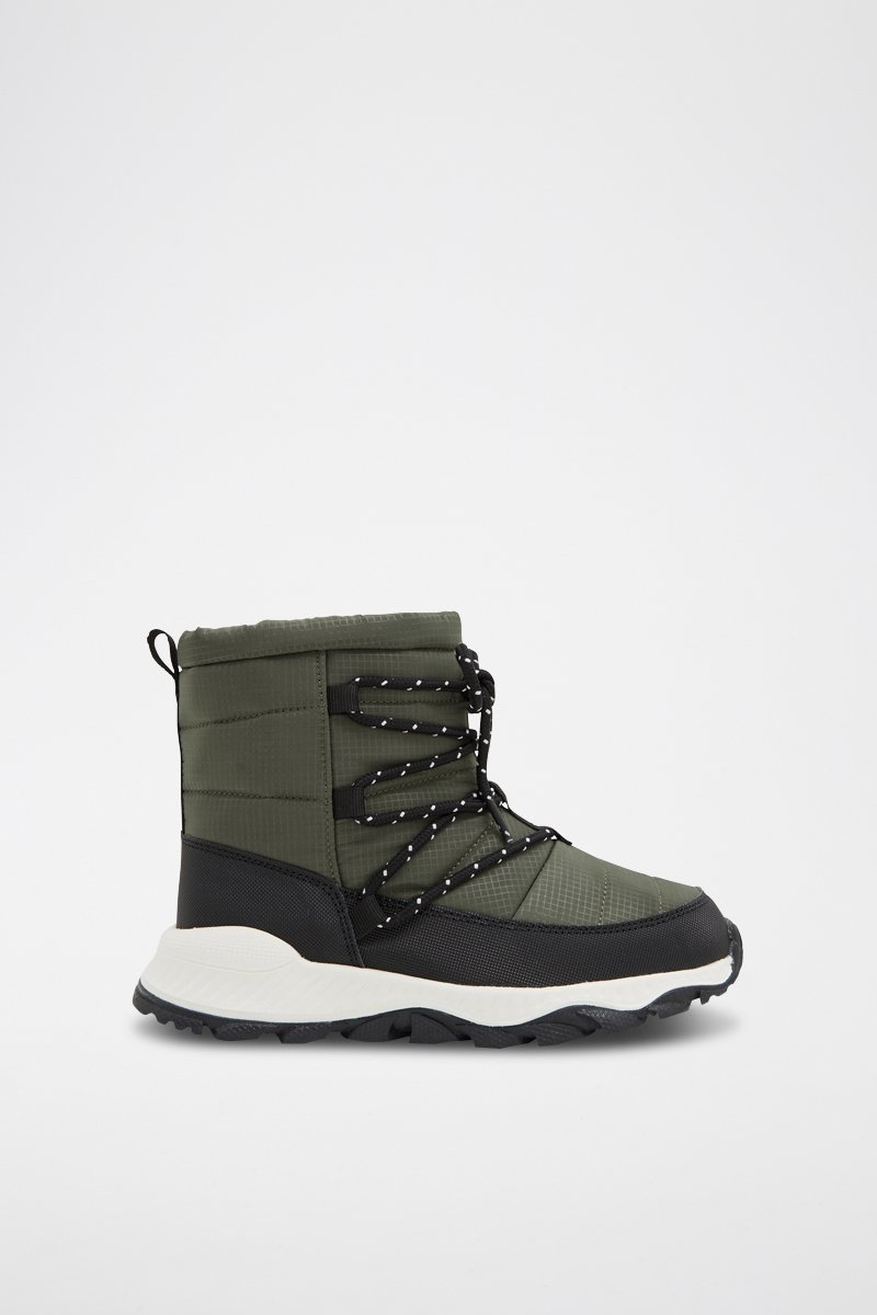 Fecho com atilhos de ajuste com trava-cordão à frente, fecho zip e velcro de lado.