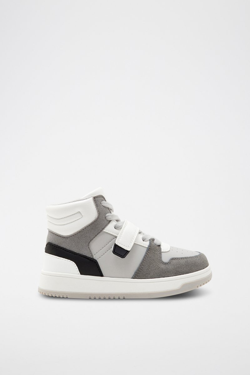 Fecho com atacadores e velcro à frente, com zip e velcro de lado.