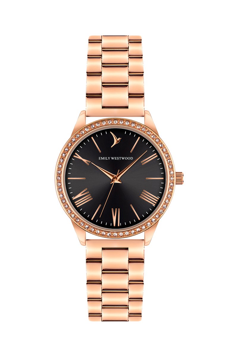 Relógio de quartzo em aço - Dourado rosa e preto - Emily Westwood