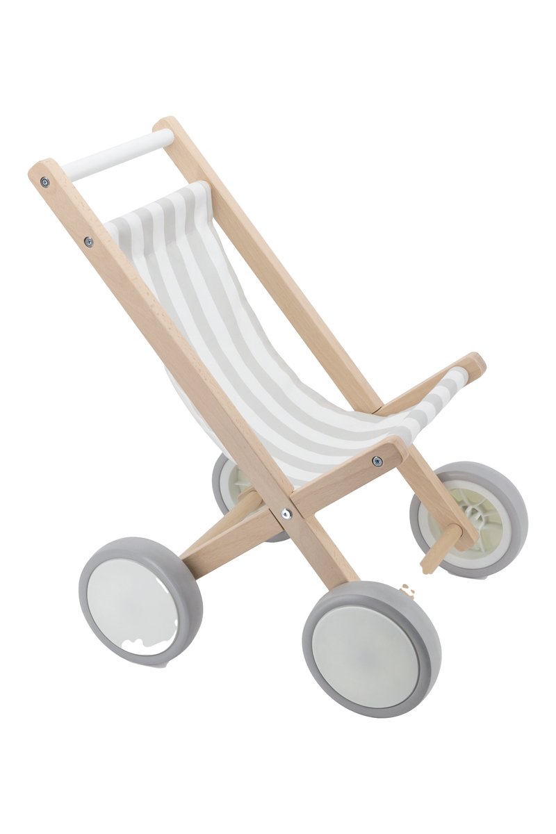 Carrinho de madeira. Grandes rodas em plástico e pneus para uma estrutura sólida e antiderrapante.