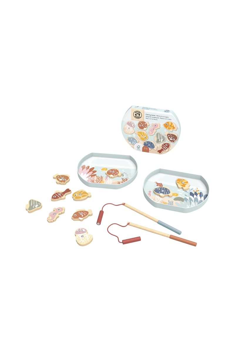 Regras do jogo: utilize a cana de pesca e divirta-se a apanhar os peixes coloridos graças à cana magnética. Quando apanhados, coloque-os delicadamente na tábua em madeira.