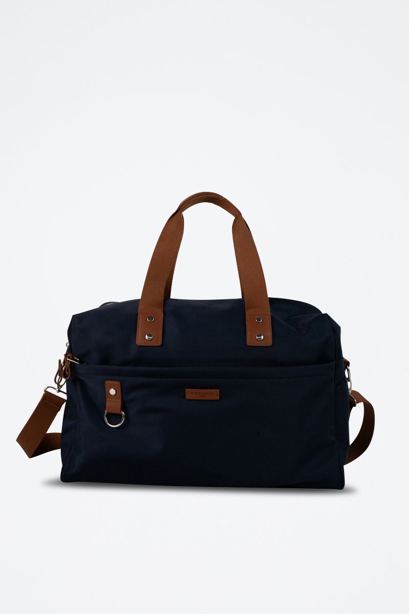 Bolso com fecho zip e aplicação com logótipo à frente.