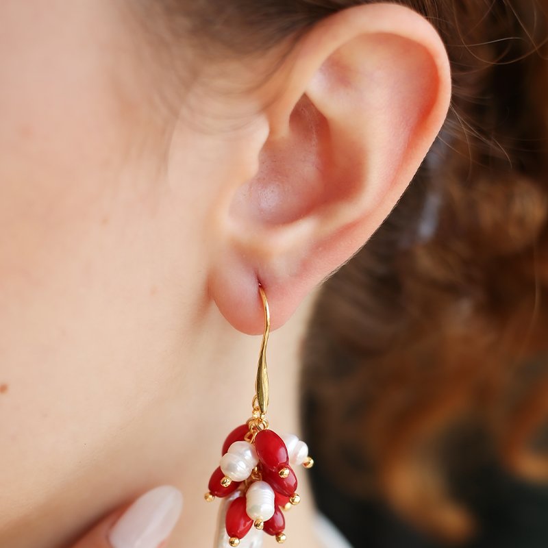 Brincos - Latão banhado a ouro, coral e pérola
