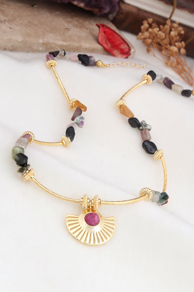 Colar banhado a ouro amarelo com turmalinas e cristais.