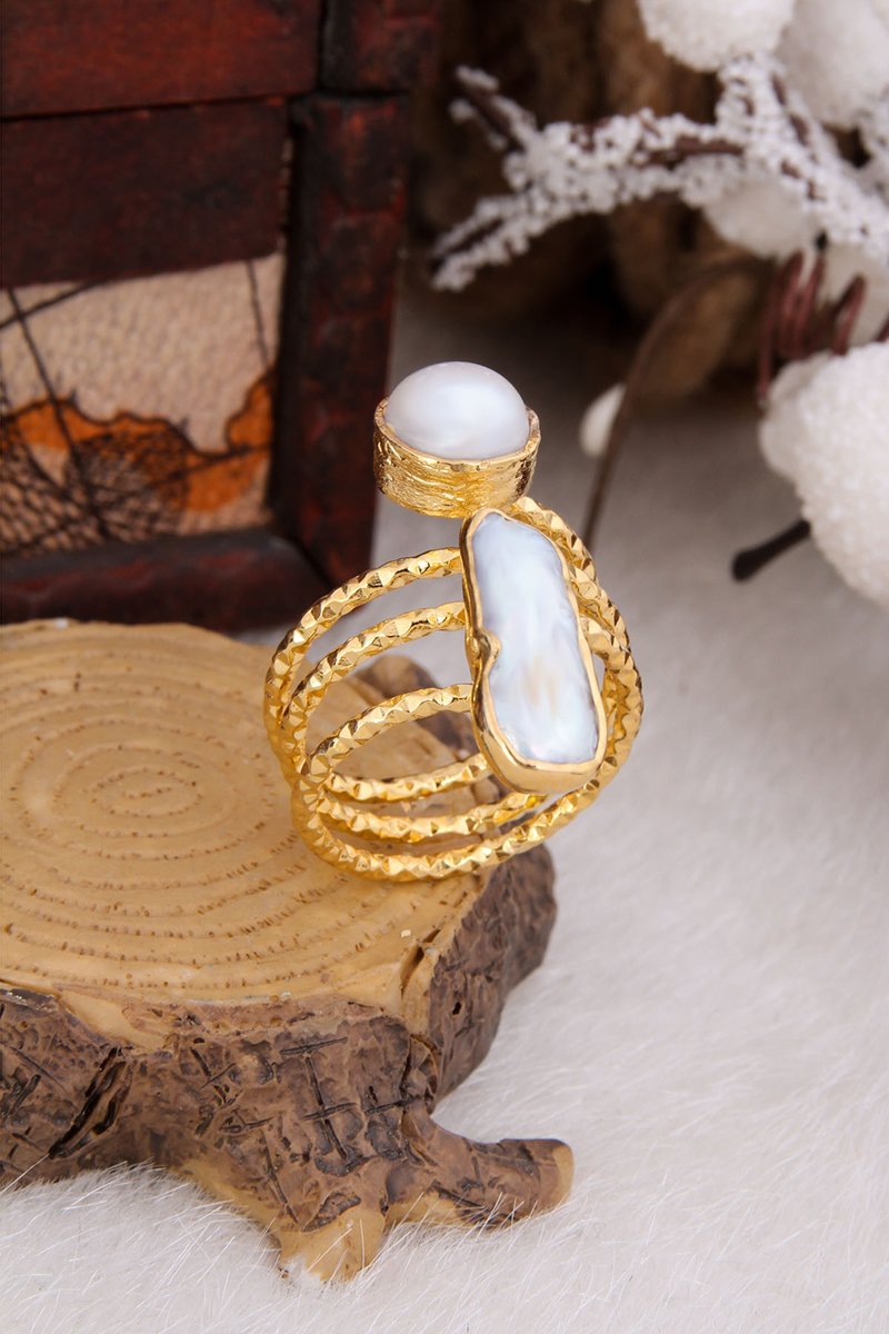 Anel ajustável banhado a ouro amarelo com 2 pérolas de cultura.