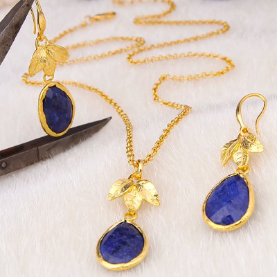 Conjunto colar e brincos - Latão banhado a ouro e safira