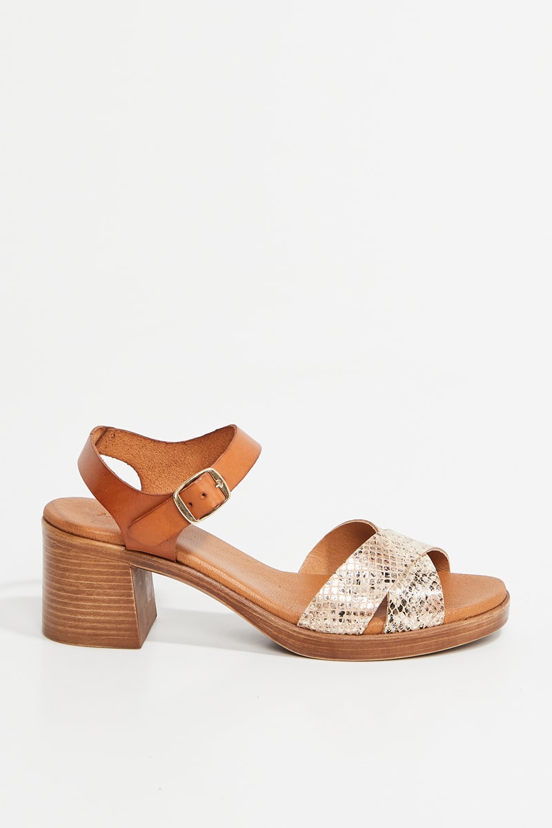 Sandálias de salto em couro Tara - Camel e prateado