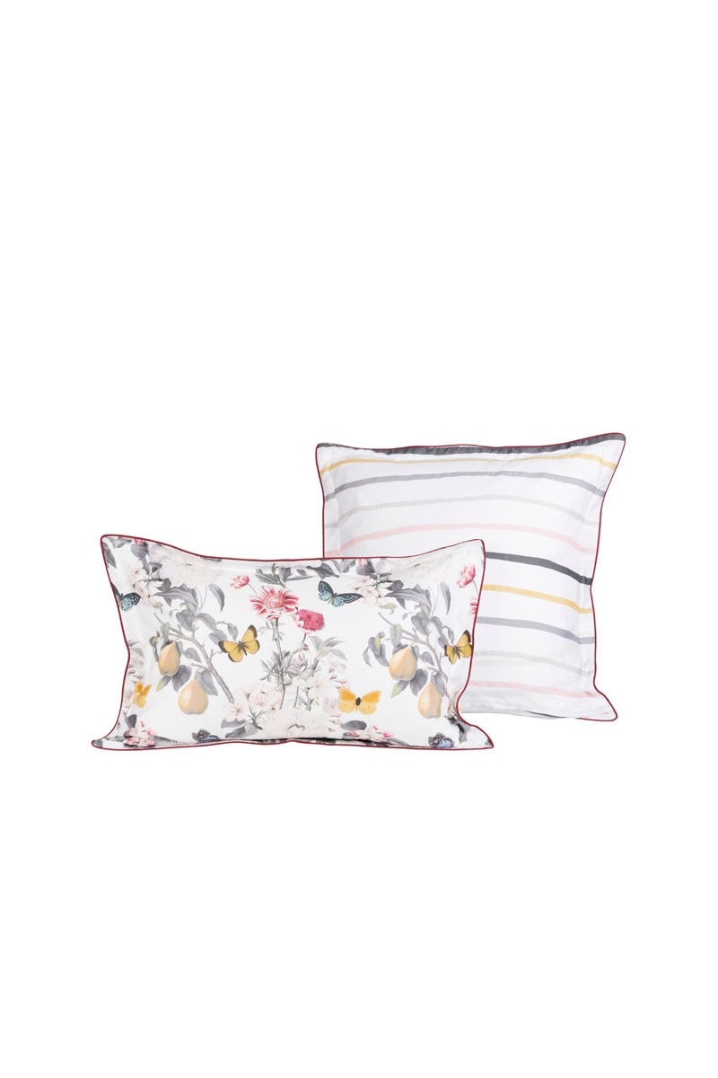 2 fronhas em cetim das quais 1 com estampado de flores e 1 com estampado às riscas.