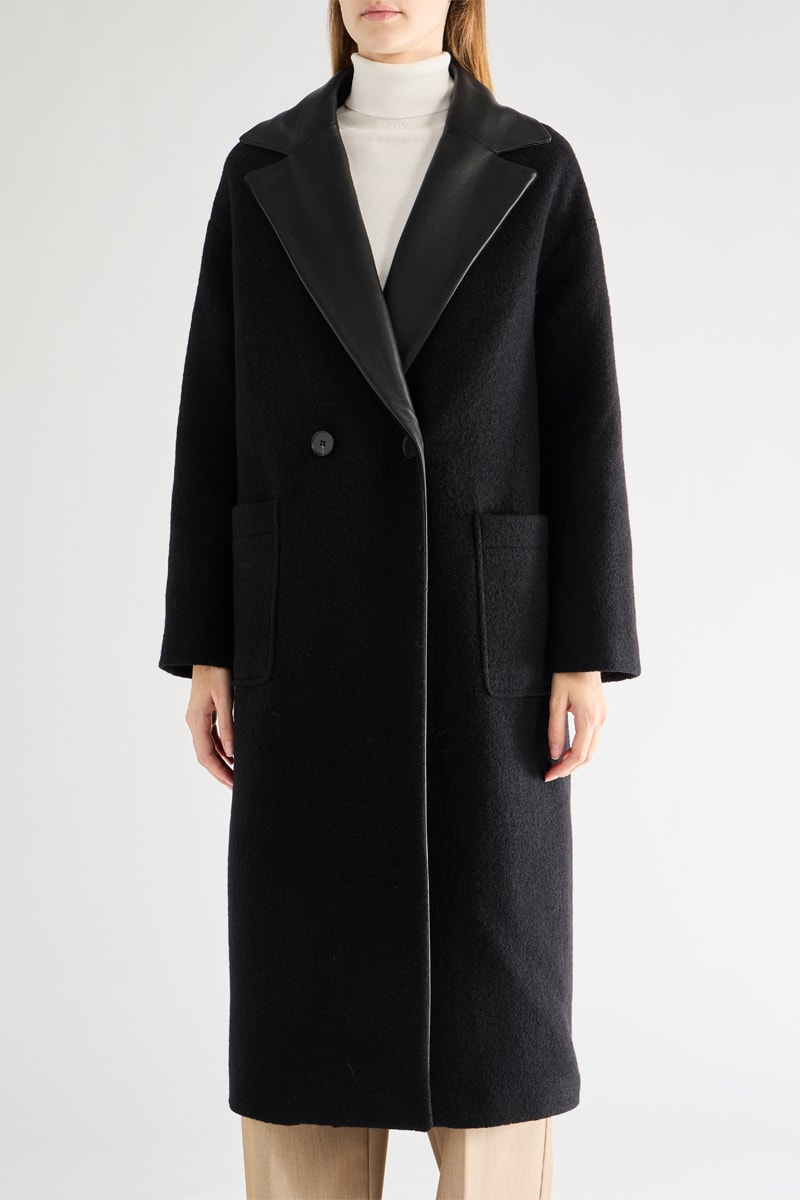 Sobretudo em lã virgem e couro de cordeiro - Preto