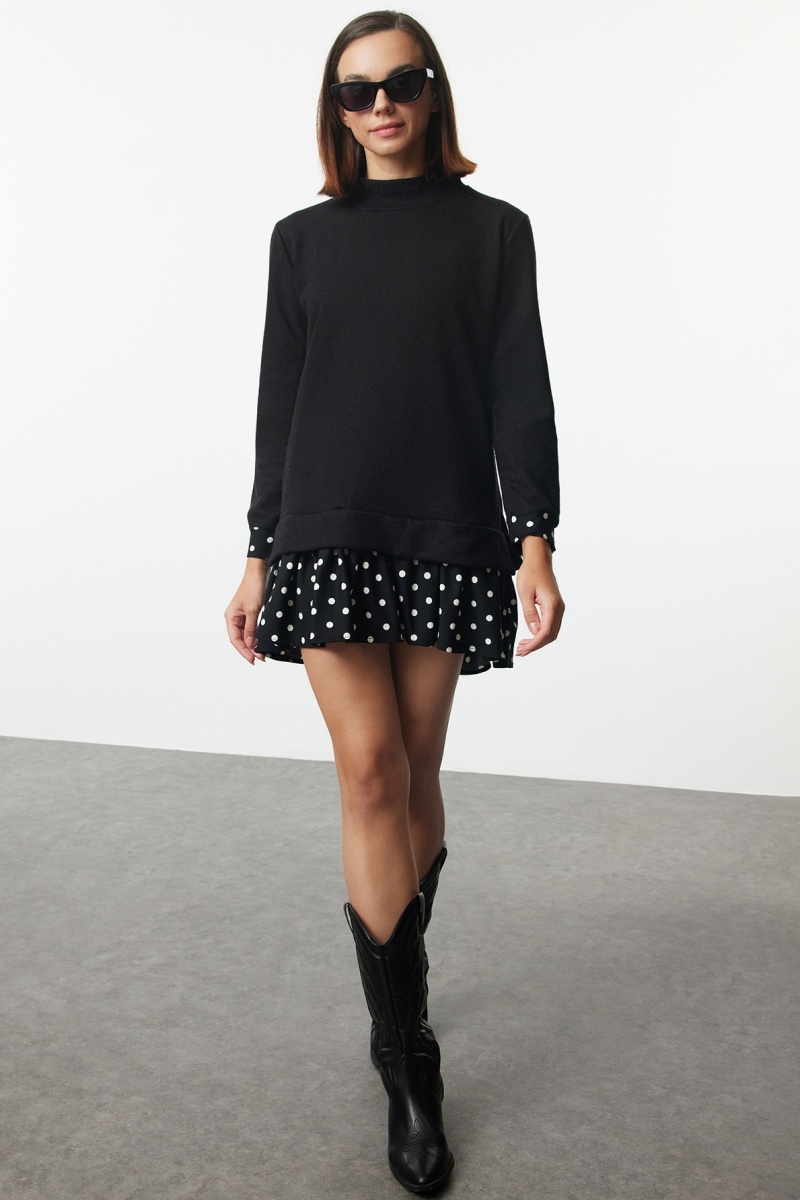 Estampado às bolas nas mangas e na saia.