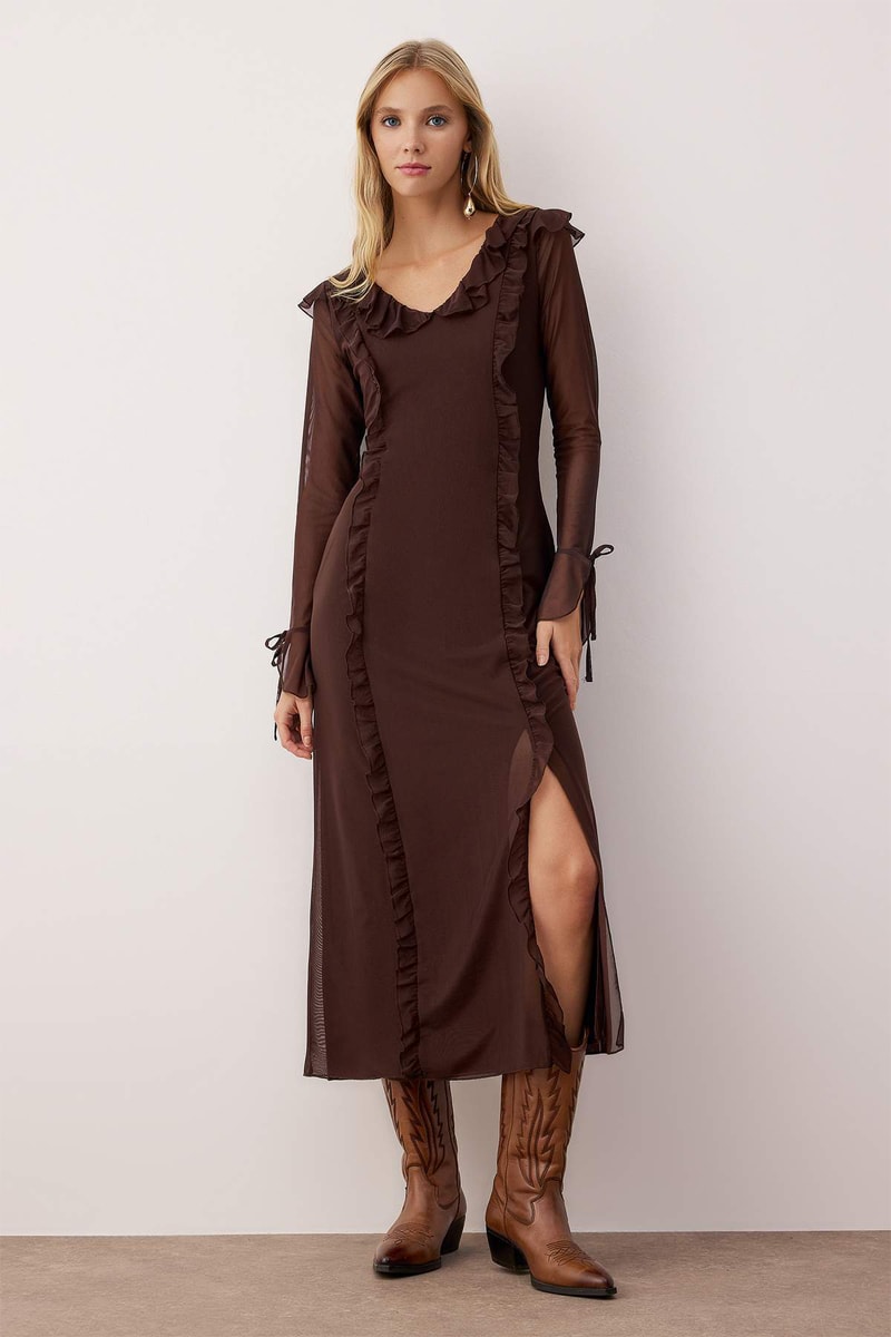 Vestido comprido de mangas compridas com abertura e atilhos de atar.