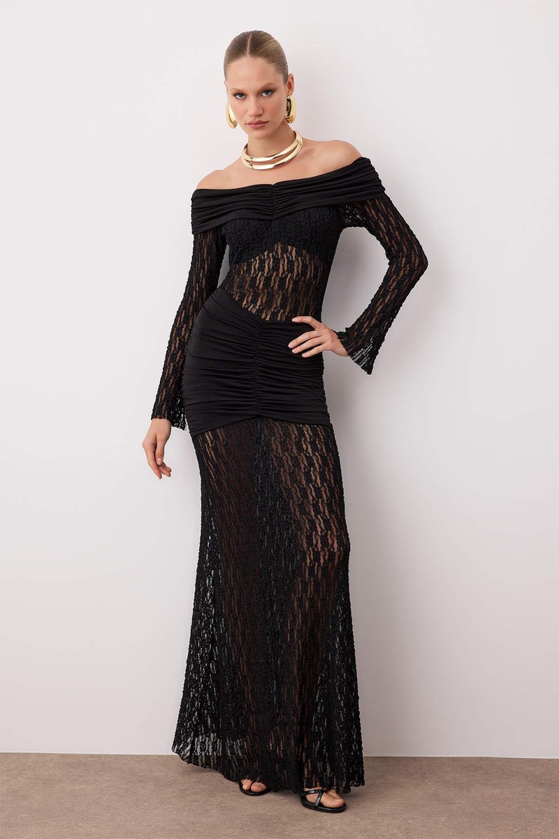 Vestido comprido bi-matéria - Preto