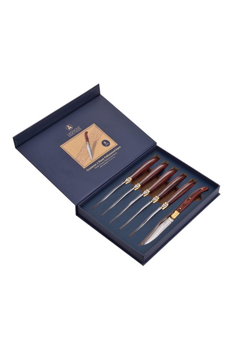 6 facas de mesa em aço inoxidável e madeira de pakka - 25 cm