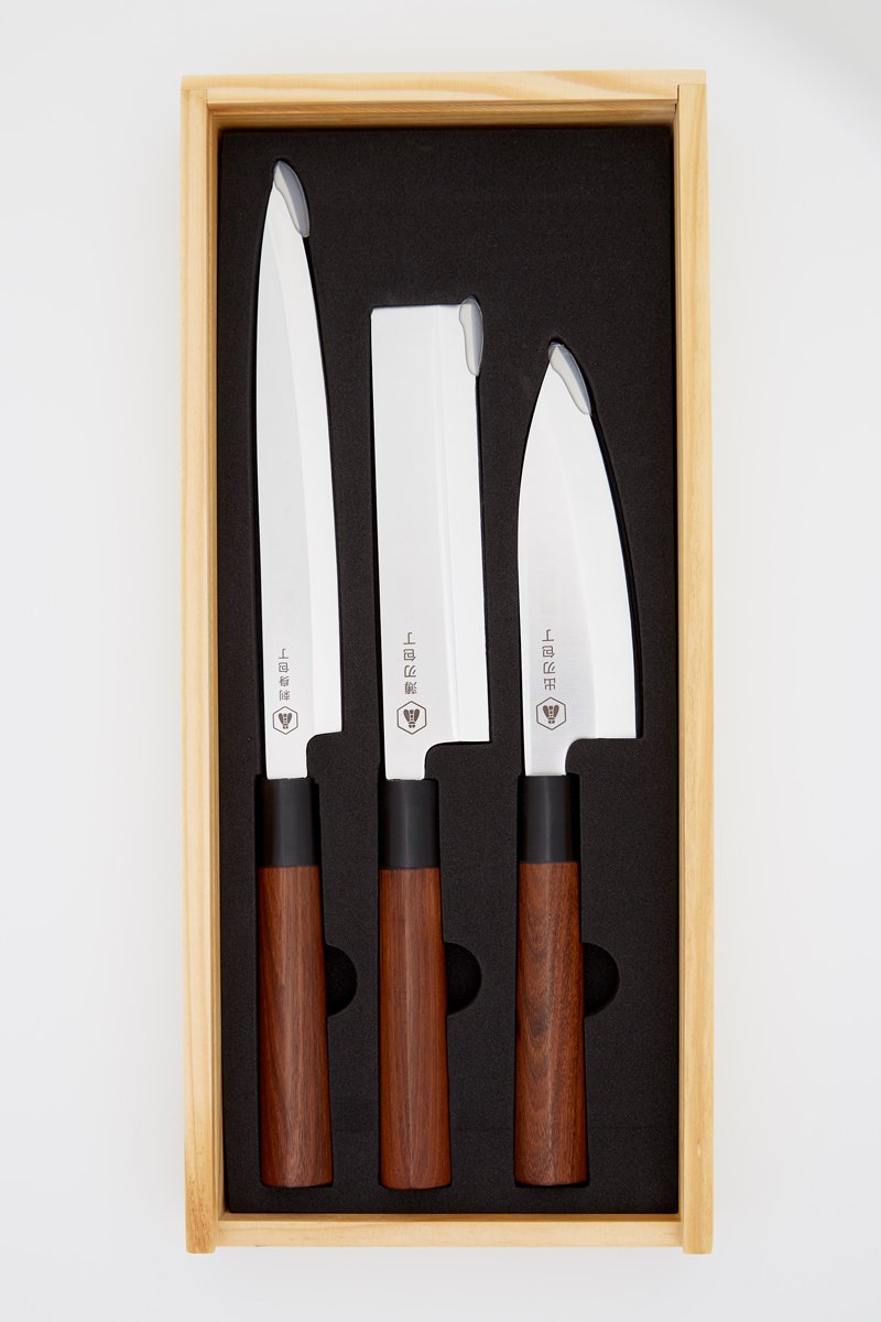 3 facas japonesas em madeira de sândalo e aço inoxidável