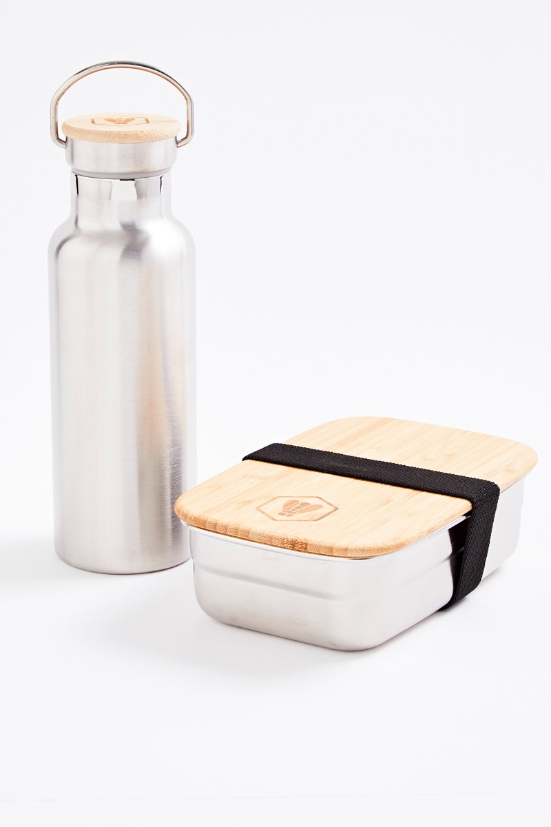 Caixa de almoço e garrafa isotérmica de bambu e aço inoxidável - 850 ml e 500 ml