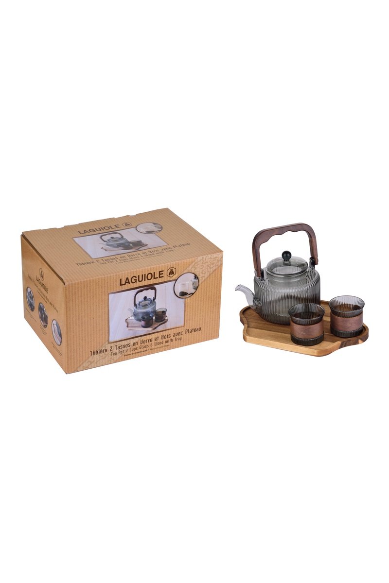 Conjunto de chá em vidro borosilicato e madeira - 4 peças