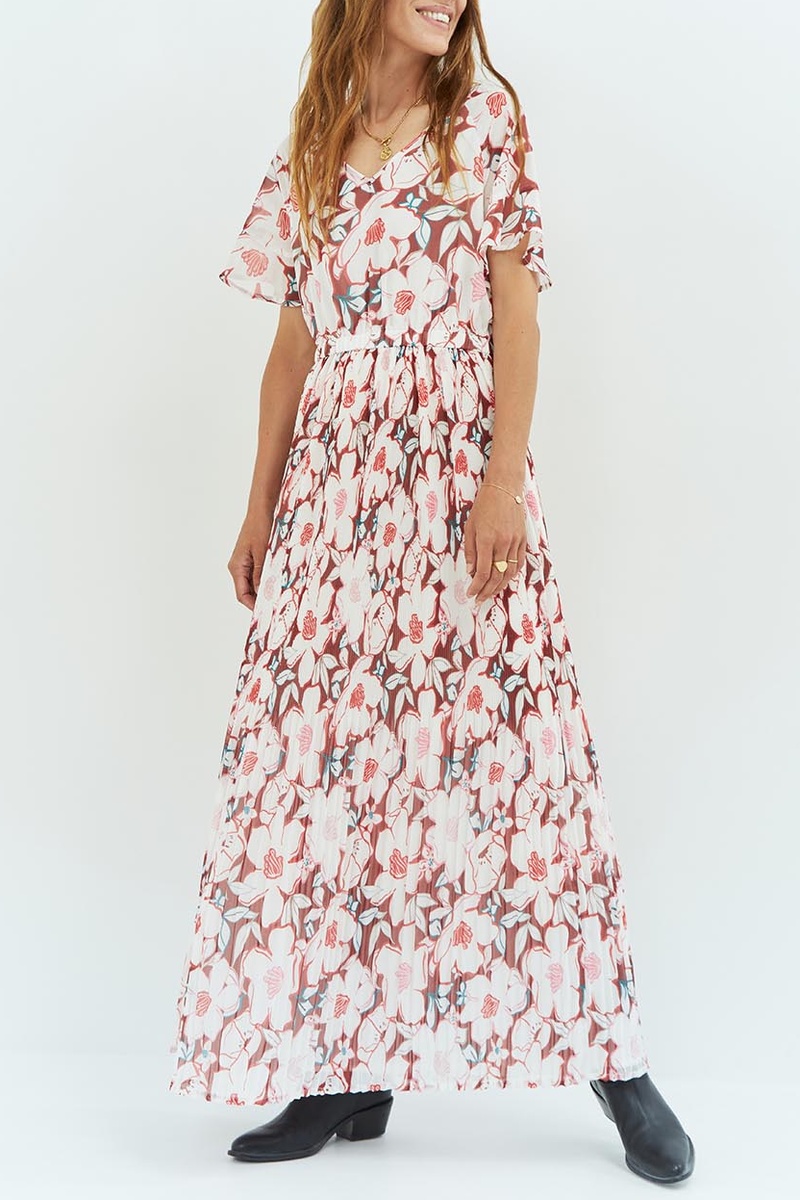 Vestido comprido de mangas curtas com folhos.