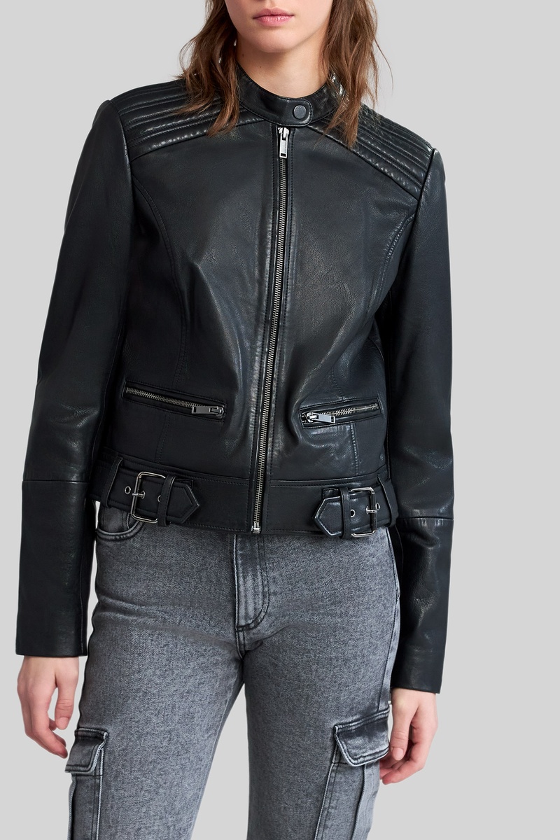 Blusão em couro de cordeiro de mangas compridas com zip.